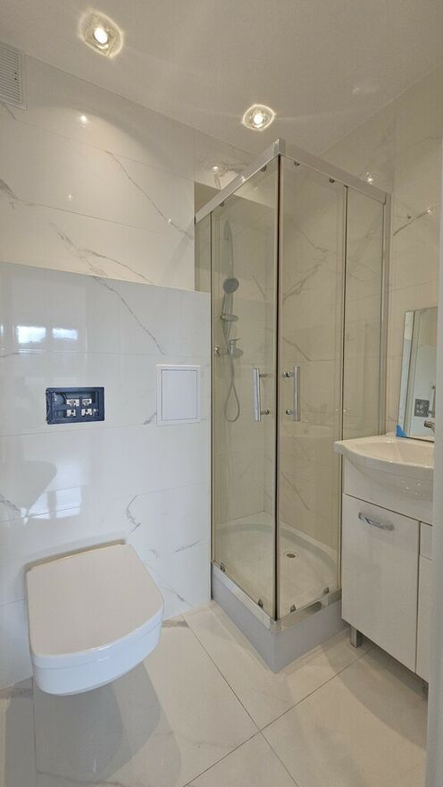 wyposażona w kabinę prysznicową oraz WC w zabudowie. Brakuje