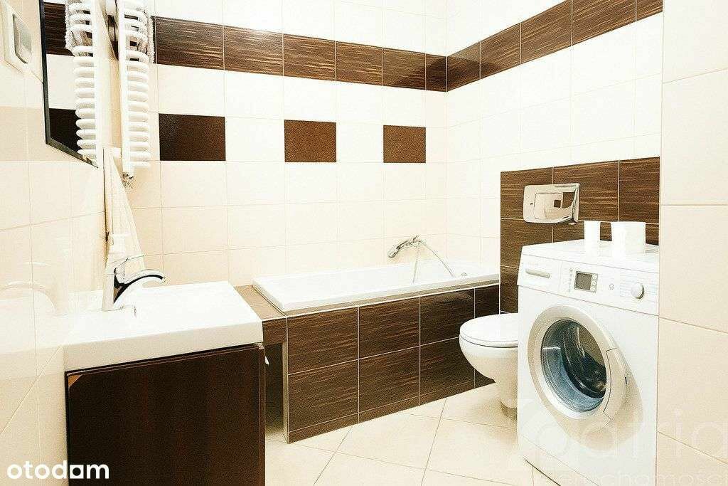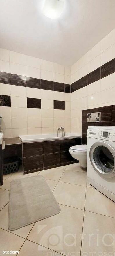 - łazienkę o pow. ok. 4,5 m2 wyłożoną glazurą i terakotą. W łazience znajdziemy również oprócz wanny, umywalki i wc także pralkę.