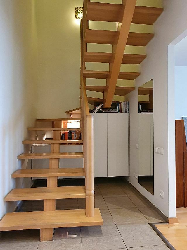 • 1st level: well-arranged living room with a kitchenette (oven, ceramic hob, microwave, dishwasher, fridge), toilet, and a balcony.