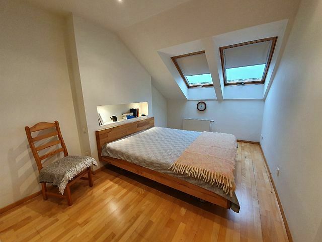 • II poziom: 2 sypialnie z pojemnymi garderobami (10 i 11 m2 plus 10m2 powierzchni pod skosami), łazienka (6m2, alternatywne ogrzewanie podłogowe) z wanną z jaccuzi, prysznicem, bidetem, wc i zabudowaną wnęką gospodarczą z pralką, itd.; rolety wewnętrzne zaciemniające i zewnętrzne przeciwsłoneczne.
