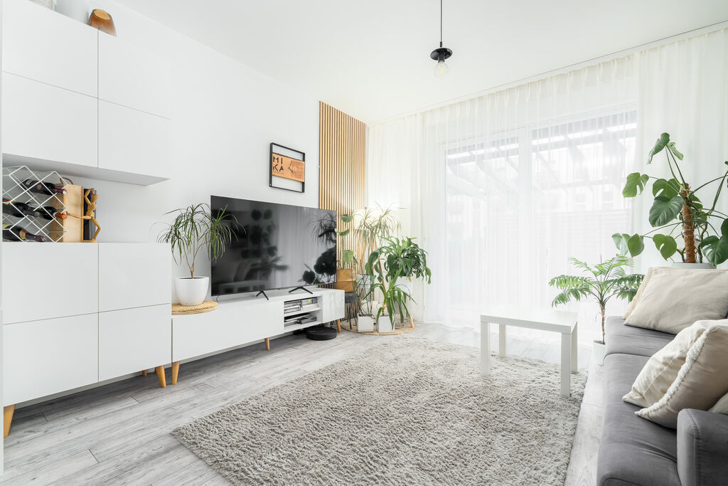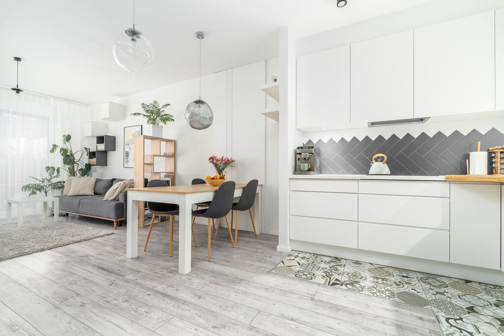 Mieszkanie posiada funkcjonalny układ obejmujący salon z aneksem