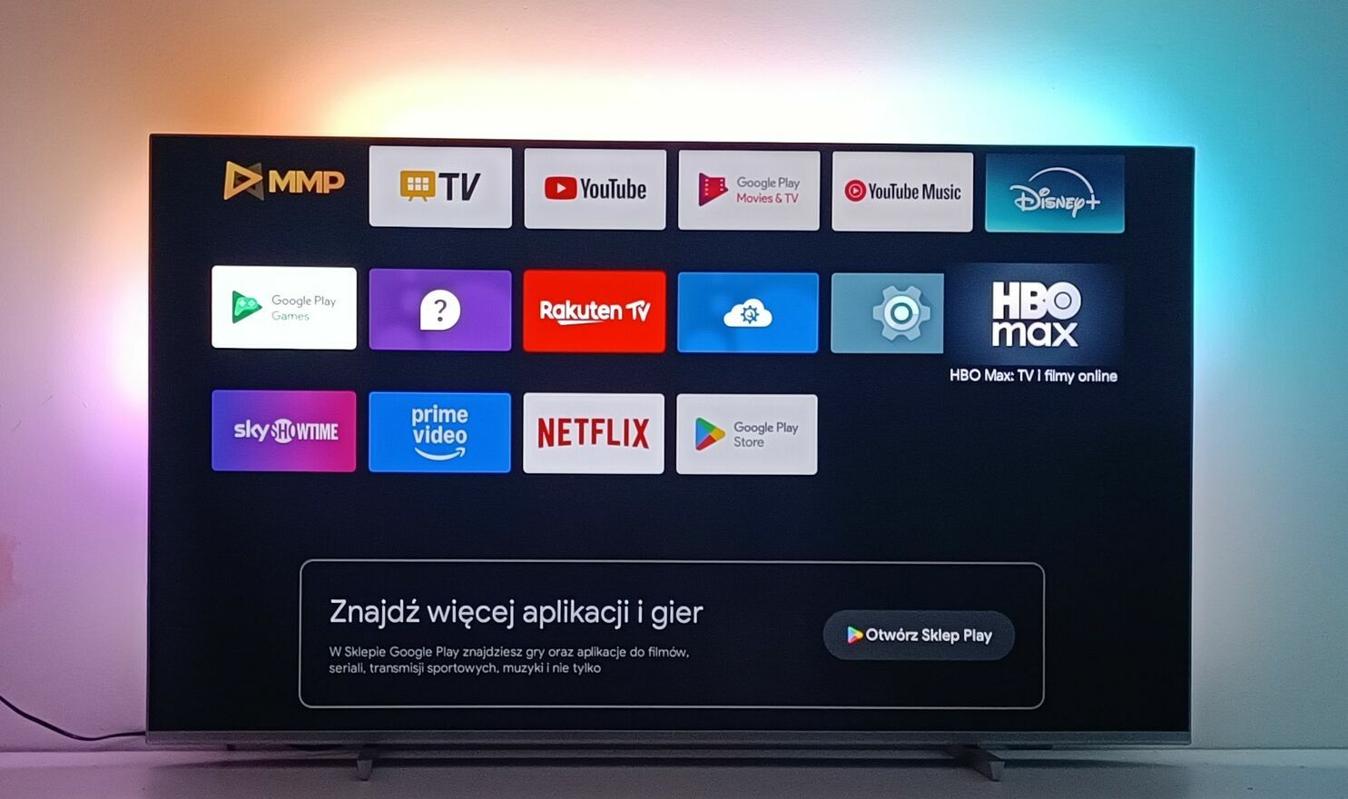 - ANDROID TV jest cała masa aplikacji :) między innymi : YouTube, Netflix, polsat box go, TVP SPORT, PREMIERY CANAL+, CANAL +, Spotify, HBO max, Disney+, skySHOWTIME, Player, Chlili, TVP.VOD, Rakuten TV, TV Cast, Prime Video, cda, Twitch, o pogodzie, zagraniczne i gry