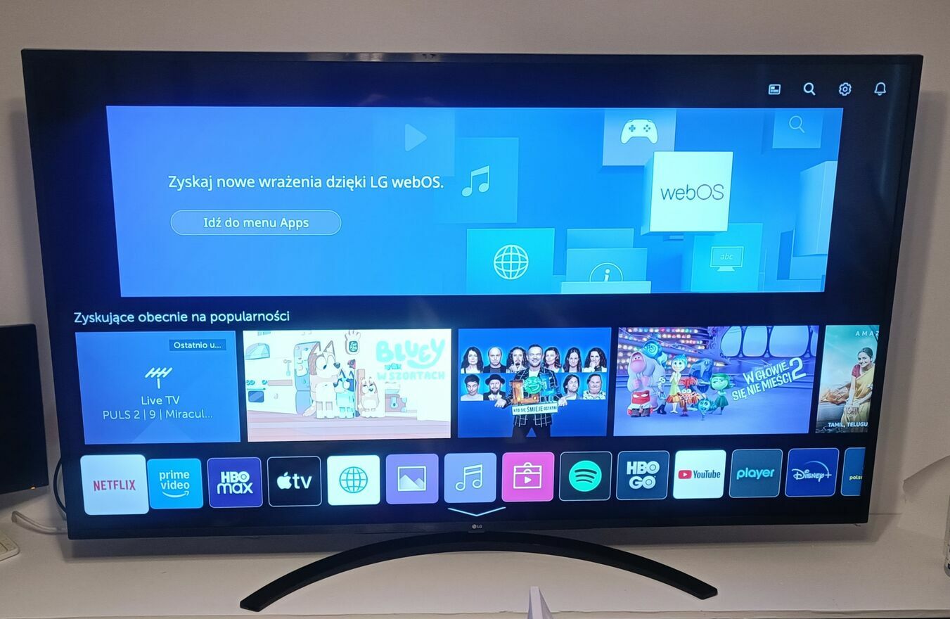 - SMART TV jest cała masa aplikacji: YouTube, Netflix, HBOmax, Spotify, cda.pl, Canal+, Polsat BOX GO, HBOGO, Viaplay, TVN24, PREMIERY Canal+, Disnay+, Twitch, Apple TV, TV Cast, TVP.VOD, TVP SPORT, Prime Video, chili, Smart IPTV, Smart IPTV Player, Rakuten TV, o pogodzie, zagraniczne i gry
