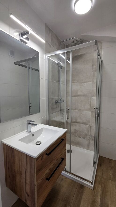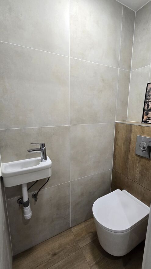 ściany gładzone, nowe podłogi, nowa łazienka, toaleta i zabudowa