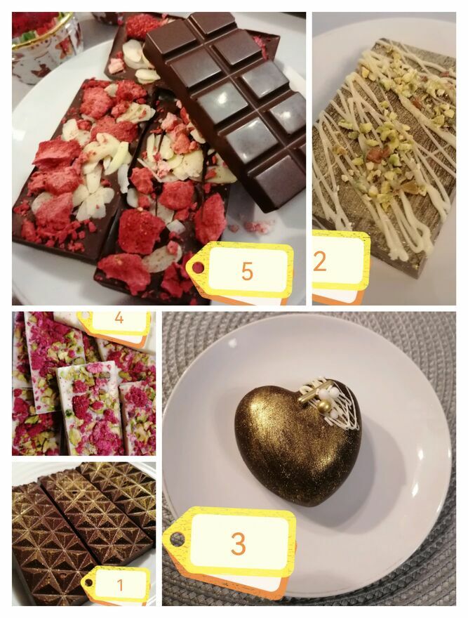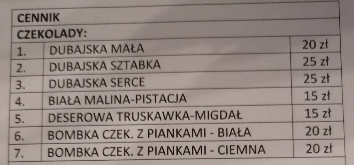 - Czekolada dubajska w trzech rodzajach (tabliczka 20zł, sztabka i serce 25zł)