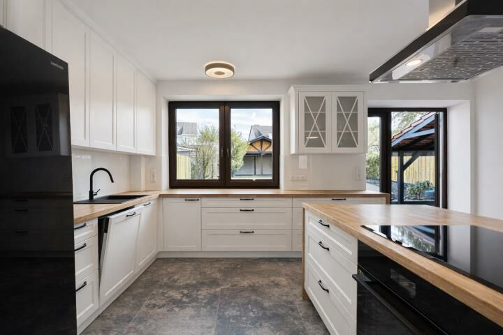 Parter: Nowoczesna kuchnia na wymiar, wykonana przez stolarza, w pełni wyposażona w sprzęt AGD premium, Wyjście na taras i ogród z kuchnią letnią, Przestronny salon z częścią jadalnianą, Toaleta, Ogrzewanie podłogowe i klimatyzacja zapewniające pełen komfort o każdej porze roku.