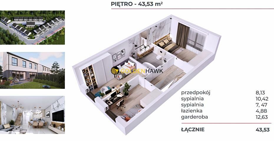 Wszystkie podane metraże to powierzchnie użytkowe bez skosów, również na piętrze. Dodatkowo nad piętrem znajduje się poddasze do zagospodarowania.