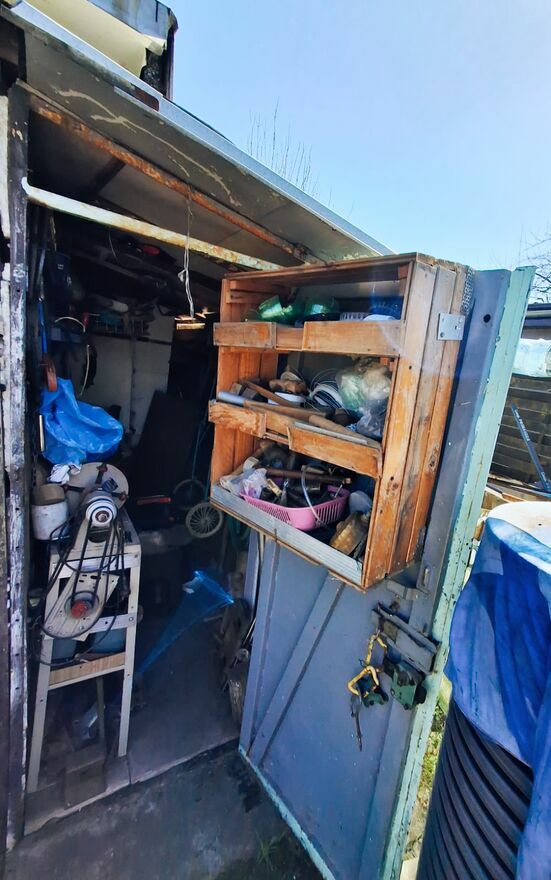 stalowa narzędziówka (ok. 3 × 1,5 m), zamykana,