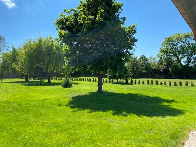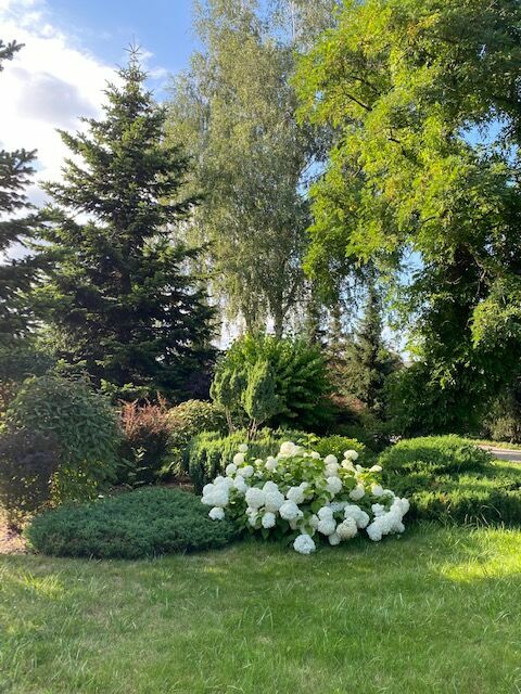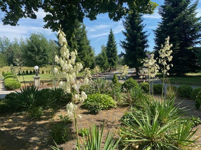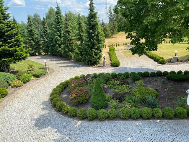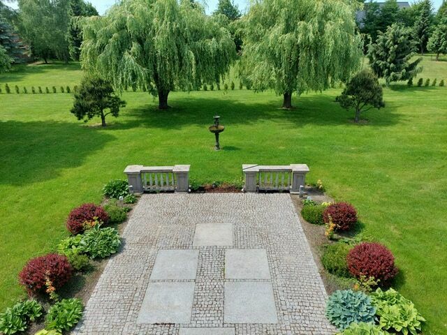 Nieruchomość jest pięknie zagospodarowana trawnikami, drzewami i krzewami oraz brukowanymi ścieżkami przypominającymi park i pozostawia bardzo zadbane wrażenie.