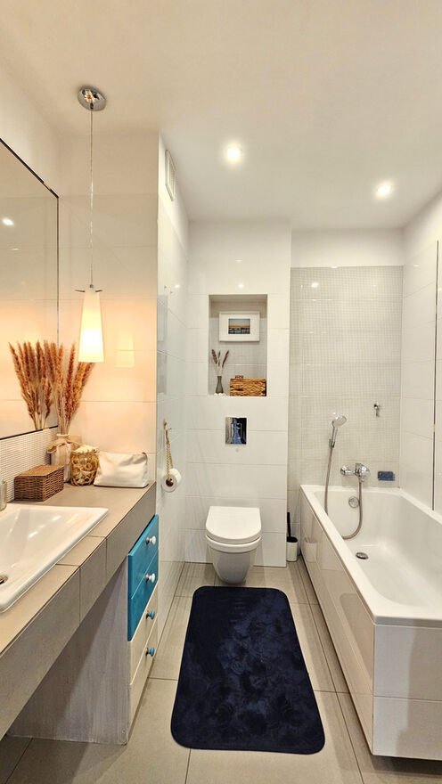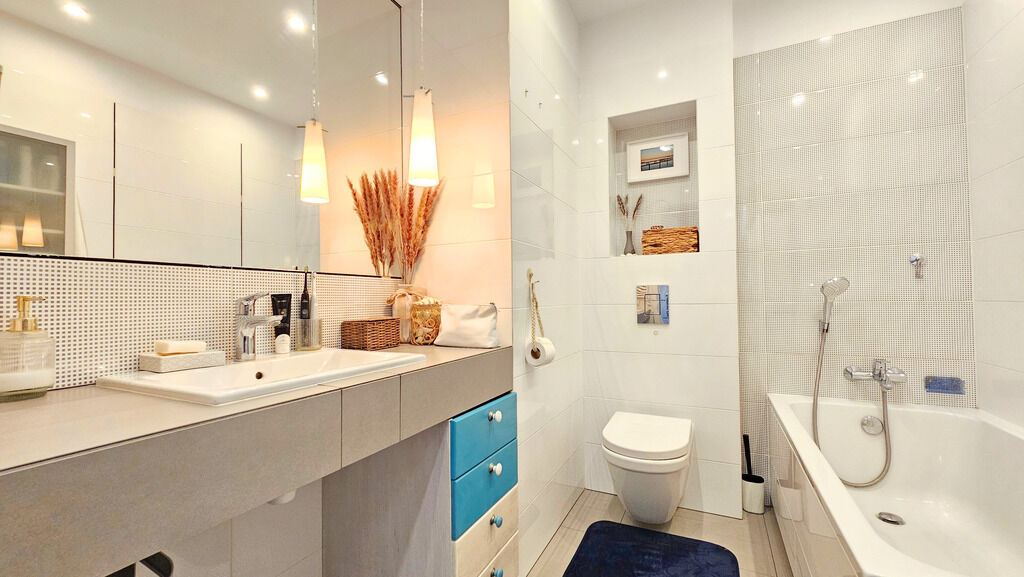 Łazienka zachwyca swoim komfortem: wanna idealna na długie wieczorne