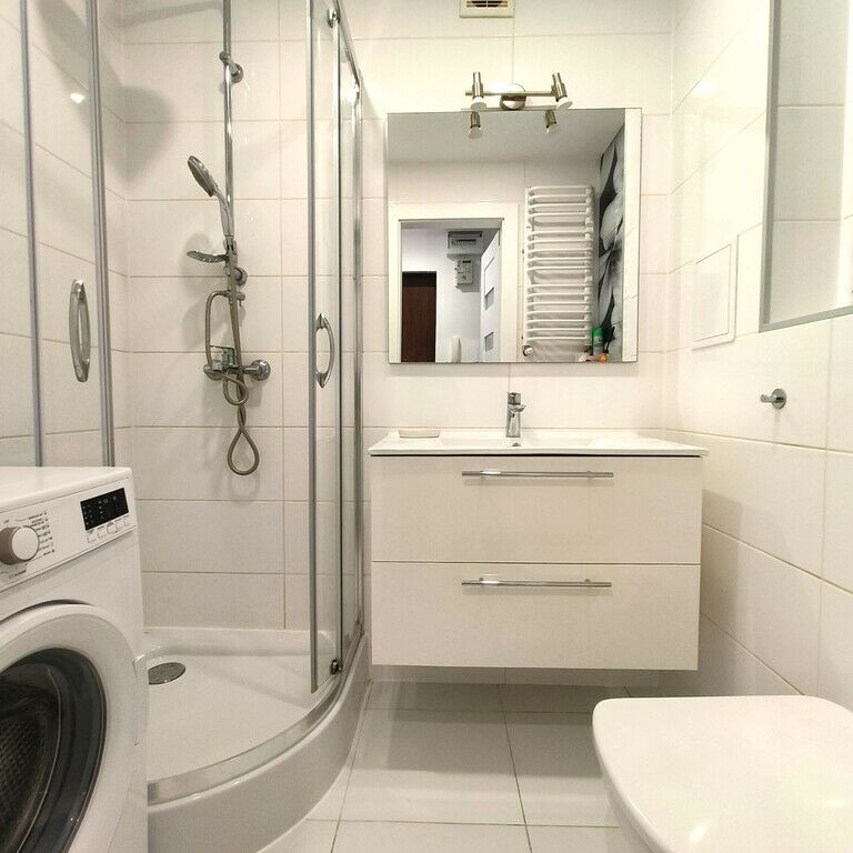 -łazienki z kabiną prysznicową, WC, umywalką z szafkami, pralką,