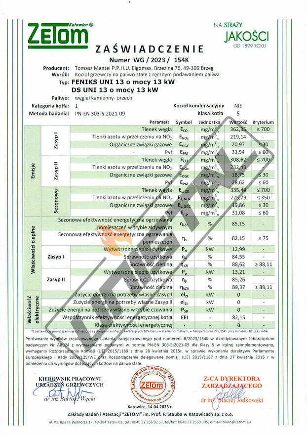 co potwierdza wysokie własności ekologiczne kotła na europejskim poziomie.