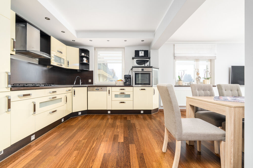 (6 m²). Kuchnia w eleganckiej zabudowie stałej, w pełni wyposażona