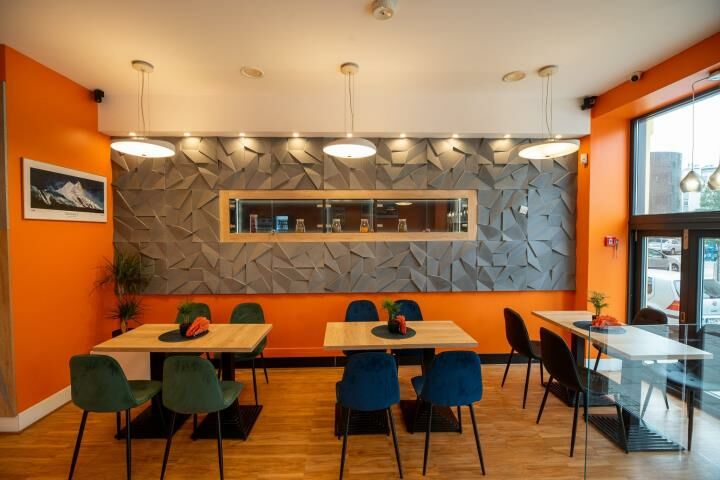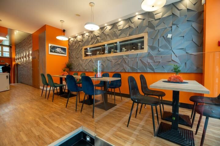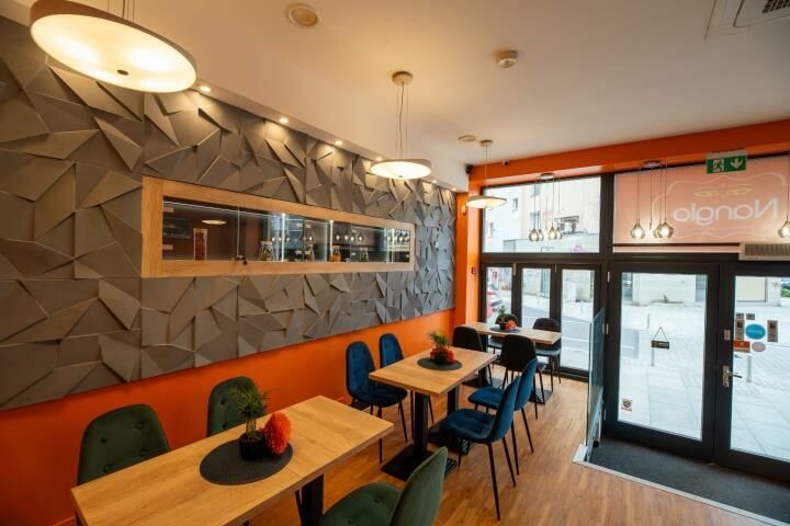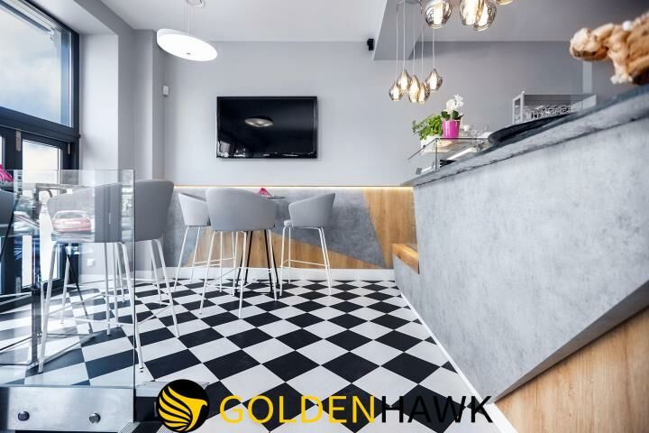 - Stoły na parterze okrągłe z białego granitu a w piwnicy kwadratowe z czarnego granitu, krzesła i hokery z podłokietnikami z eko-materiału (bardzo łatwo zmywalne).