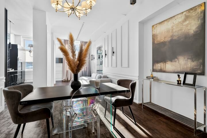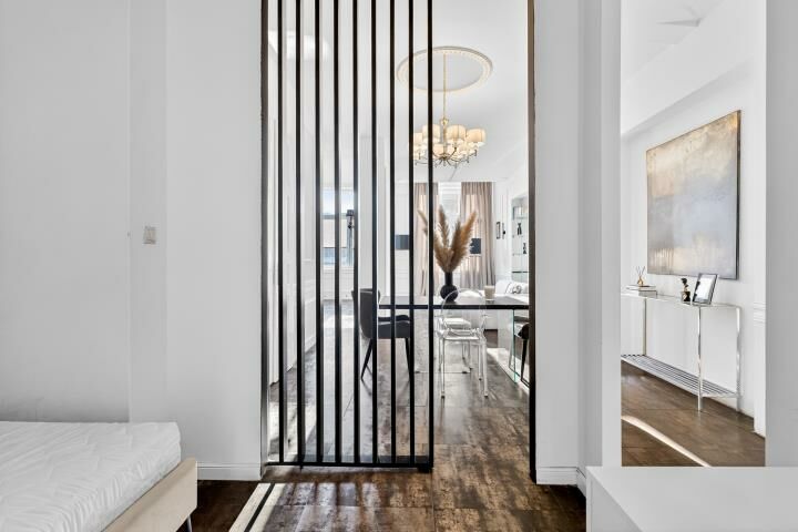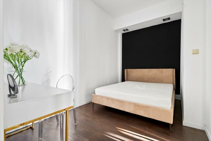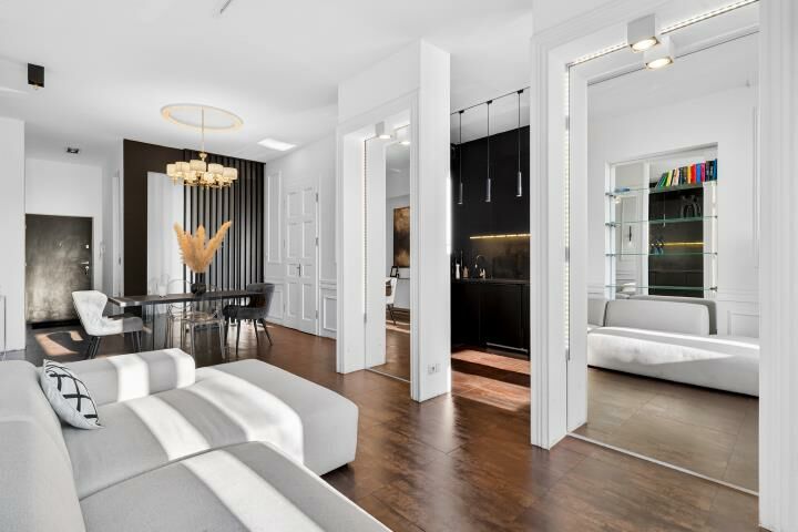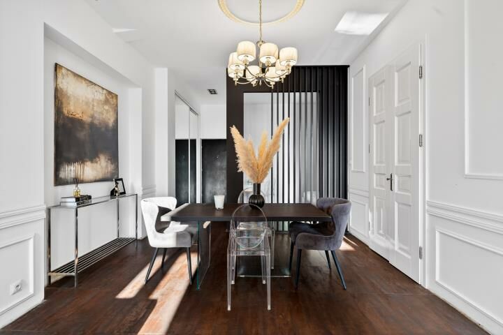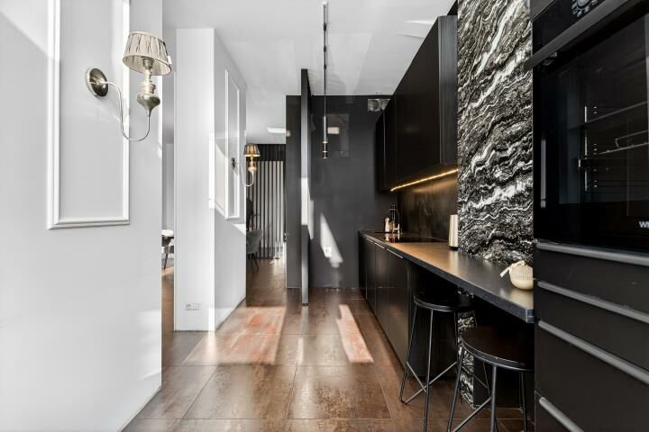 Aranżacja mieszkania została wykonana z wyjątkowym smakiem i bez kompromisów. Dominują tu szlachetne, ciemne tonacje, które w połączeniu z odpowiednio zaprojektowanym oświetleniem tworzą intymną, elegancką atmosferę rodem z nowojorskich apartamentów. To wnętrze jest nietuzinkowe, zdecydowane i bardzo charakterne idealne dla osób, które szukają czegoś więcej niż standardowych rozwiązań.