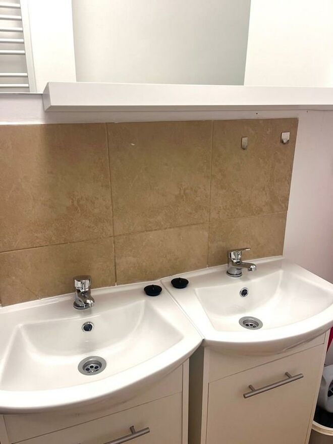 Łazienka: WC, dwie kabiny prysznicowe, umywalka, pralka.
