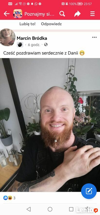 Witam serdecznie nazywa się Marcin mieszkam i pracuje w Danii i tu chcę mieszkać. Jestem wesołym, energicznym, inteligentnym zaradnym mężczyzną, mam plany i marzenia które powoli spełniam. Jestem po kilku nie udanych związkach. Szukam kobiety do stałego związku, założenia rodziny, do wspólnego życia i wszystkiego co się wiąże z tym.Sprawdź zainteresowanie tym ogłoszeniem