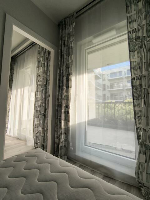 Składa się z salonu z aneksem kuchennym i wyjściem na duży 11 m2 taras, sypialni z szafą, łazienki z prysznicem i WC oraz korytarza z dużą szafą.