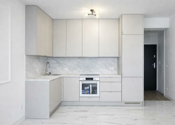 -salonu z aneksem kuchennym wyposażonym w sprzęt AGD,