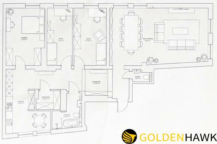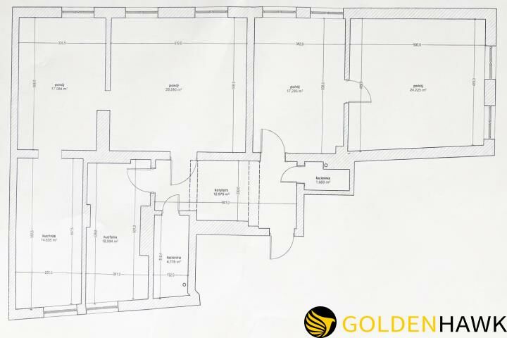 Aktualnie w mieszkaniu wyodrębnione jest 5 pokojów, 2 łazienki, 2 kuchnie i korytarz. Z powodzeniem można jednak zmienić układ pomieszczeń - jedna z propozycji została umieszczona w postaci dodatkowego rzutu w zdjęciach ofertowych.