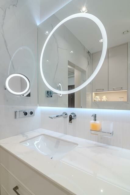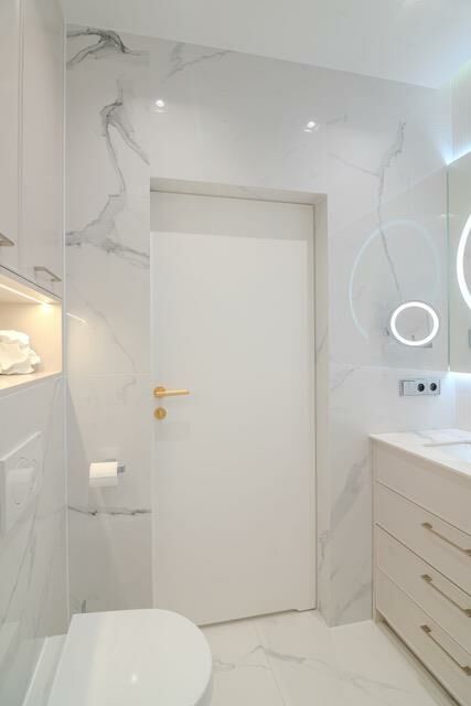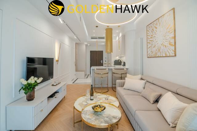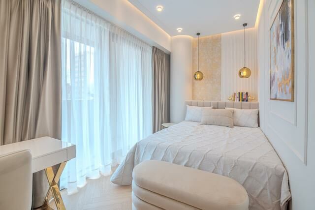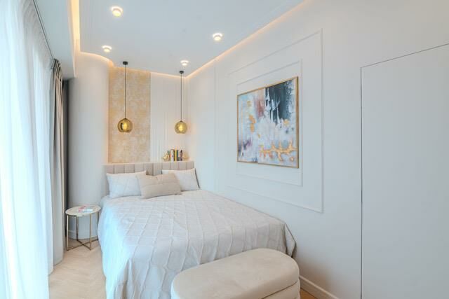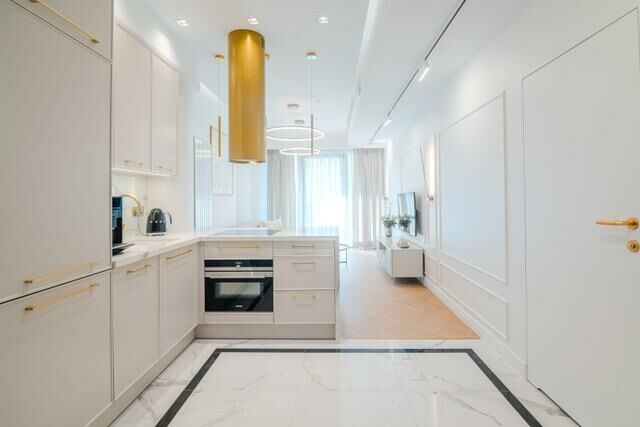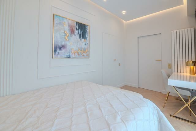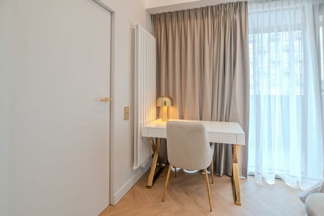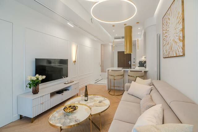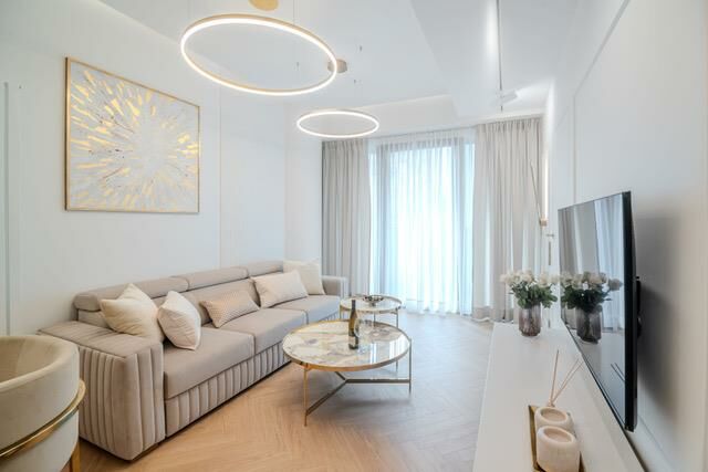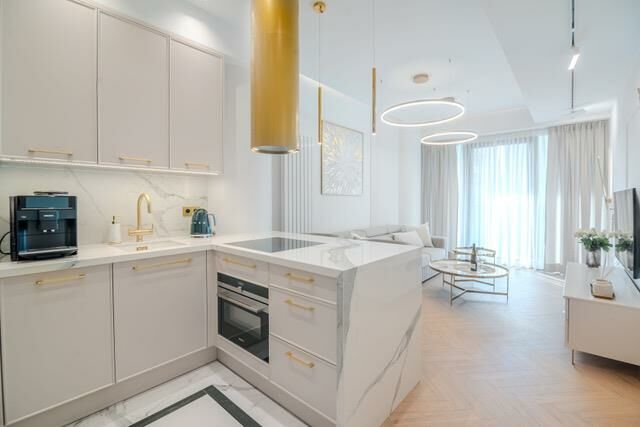 Mieszkanie o powierzchni 45 m2 jest nowe, zaaranżowane przez projektanta wnętrz i wykończone z najlepszych materiałów, w pełni umeblowane i wyposażone w sprzęt RTV/AGD.