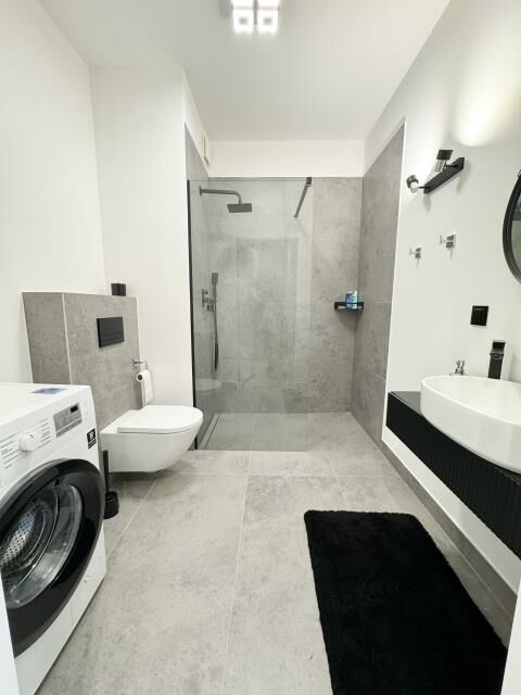 - łazienki z prysznicem w stylu walk-in, toaletą, umywalką i pralką