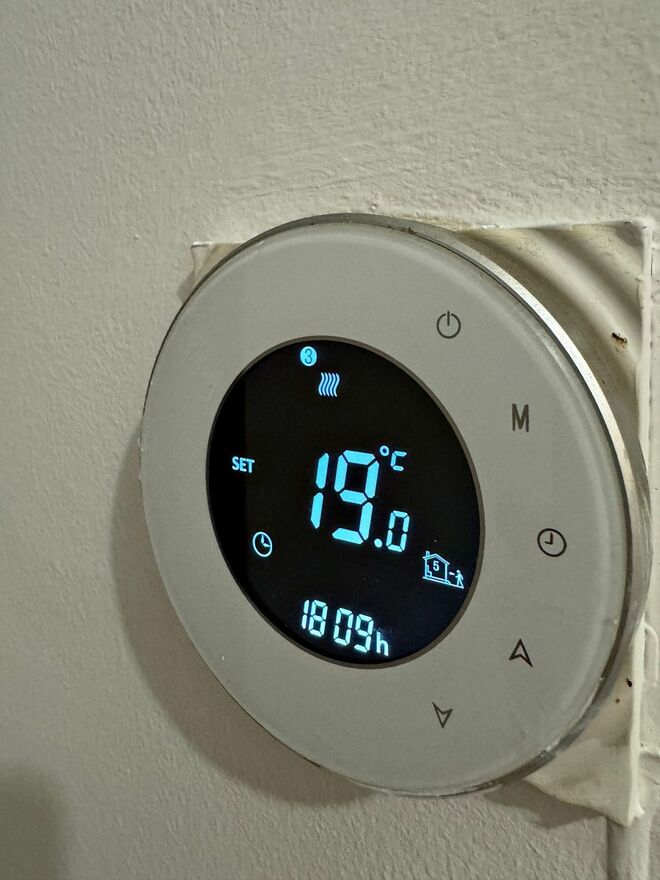 Ogrzewanie mieszkania podłogowe matami elektrycznymi. W każdym pomieszczeniu na ścianie zamontowane jest urządzenie do sterowania ogrzewaniem.