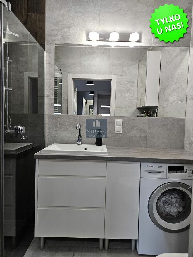 *łazienka: prysznic typu walk-in, pralka, a także miska ustępowa i umywalka oraz szafki wykonane na wymiar w systemie BLUM,