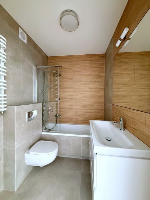 Mieszkanie o powierzchni 54 m2 składa się z salonu z aneksem kuchennym i wyjściem na balkon, dwóch sypialni oraz łazienki z wanną i WC.