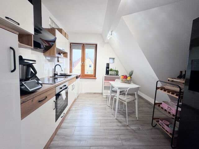 Do mieszkania przynależą dwie piwnice o powierzchni ok 10m2 oraz połowa strychu. Ogród może służyć jako parking dla 2/3 aut.