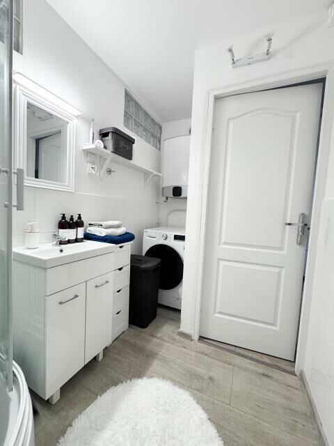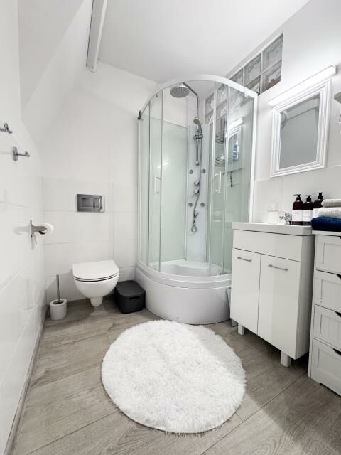 - łazienka z prysznicem, umywalką, WC oraz miejscem na pralkę.