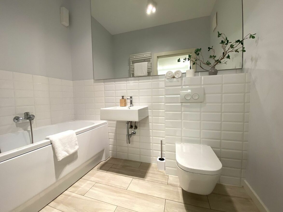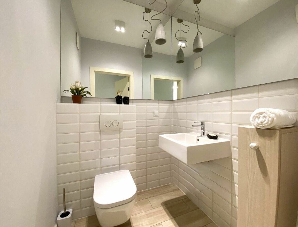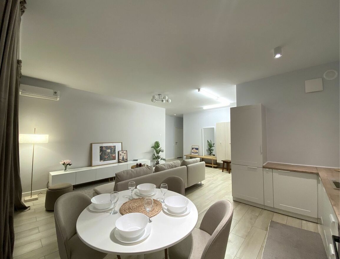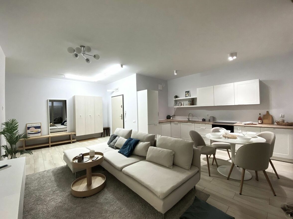 W sypialni materac. Kuchnia wyposażona w lodówkę z zamrażarką, piekarnik, mikrofalówkę, zmywarkę, płytę indukcyjną.
