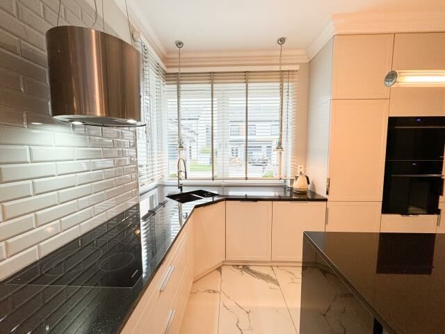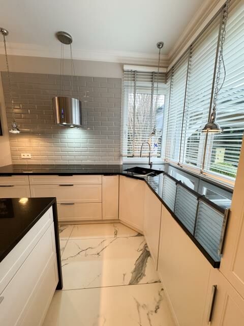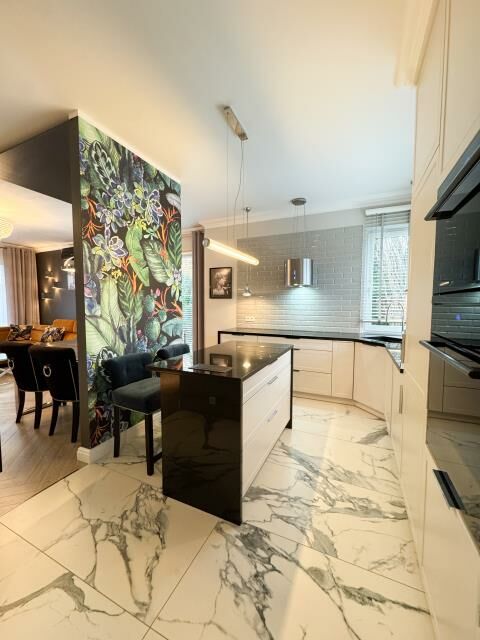 - Otwarta kuchnia wykonana przez stolarza, z wysokiej klasy lakierowanymi frontami oraz kamiennym blatem. W pełnej zabudowie: lodówka, piekarnik, mikrofalówka, płyta indukcyjna, a dodatkowo funkcjonalna wyspa z hokerami.