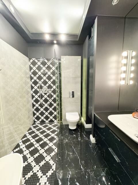 - Stylowa łazienka z prysznicem walk-in, wolnostojącą wanną, umywalką oraz ukrytym piecem gazowym.