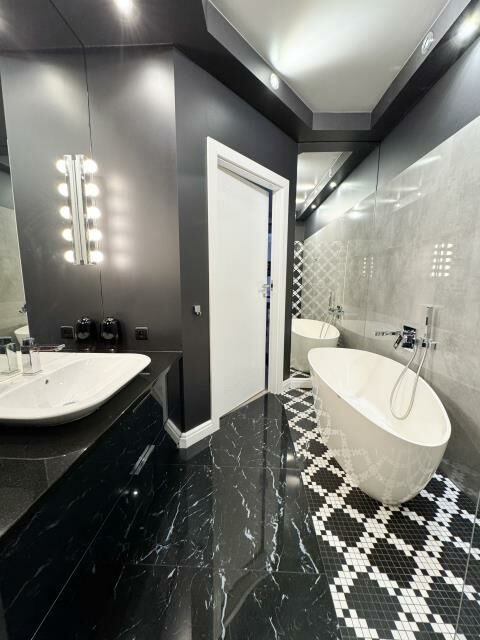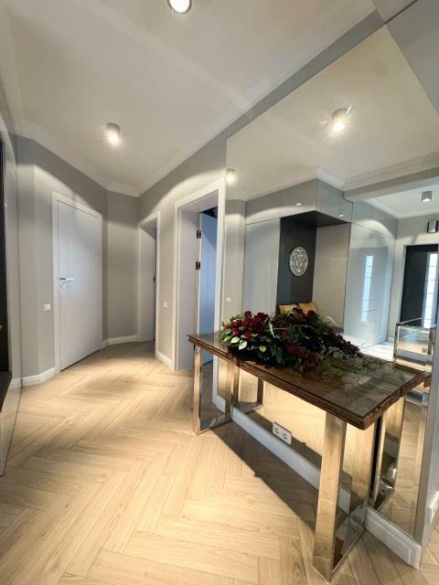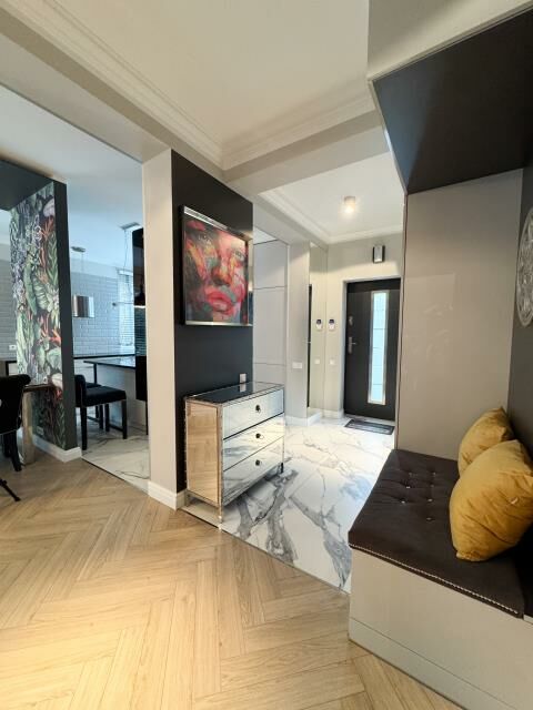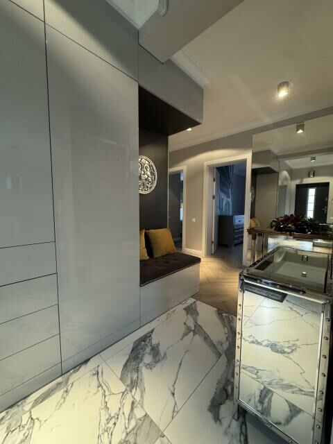 Cały apartament został zaprojektowany przez architekta i wykończony z materiałów najwyższej jakości, z dbałością o każdy detal. Wnętrze jest jasne, eleganckie i funkcjonalne, a liczne zabudowy stolarskie oraz lustra nadają mu przestronności i lekkości.