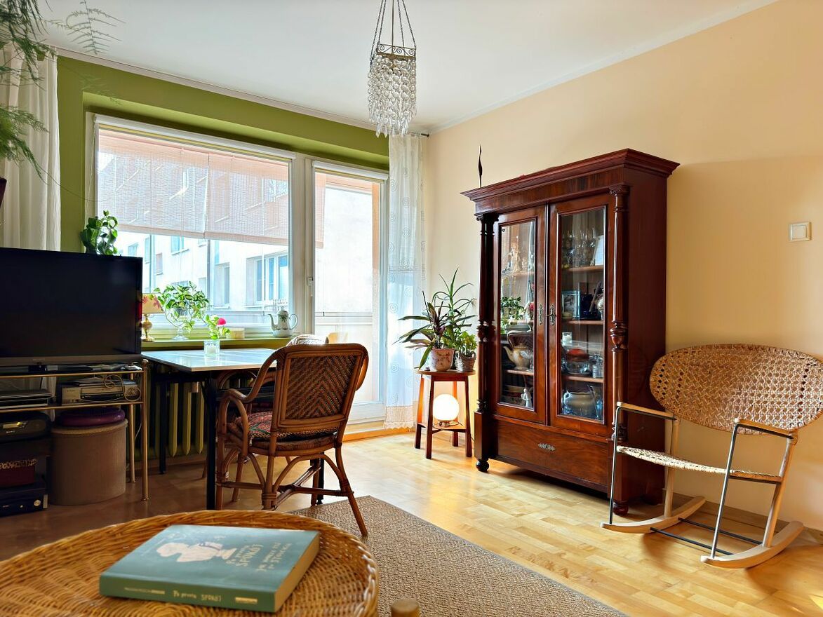 Przedmiotem oferty, jest mieszkanie 2 pokojowe (42,23 m2) z przeszklonym balkonem (+ 5,7 m2) od strony południowej oraz pomieszczeniem gospodarczym (ok. 4m2) znajdującym się przed wejściem do mieszkania. Pomieszczenie wynajmowane jest od spółdzielni za dodatkową opłatą miesięczną i służy do użytku prywatnego.