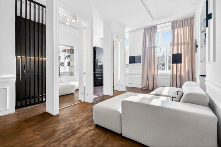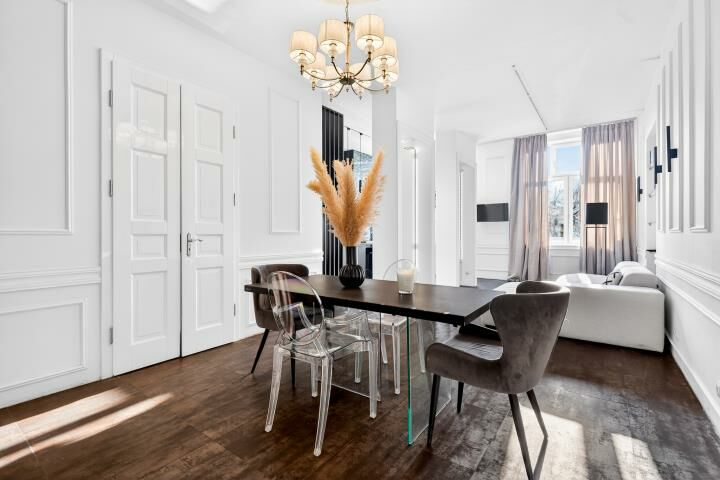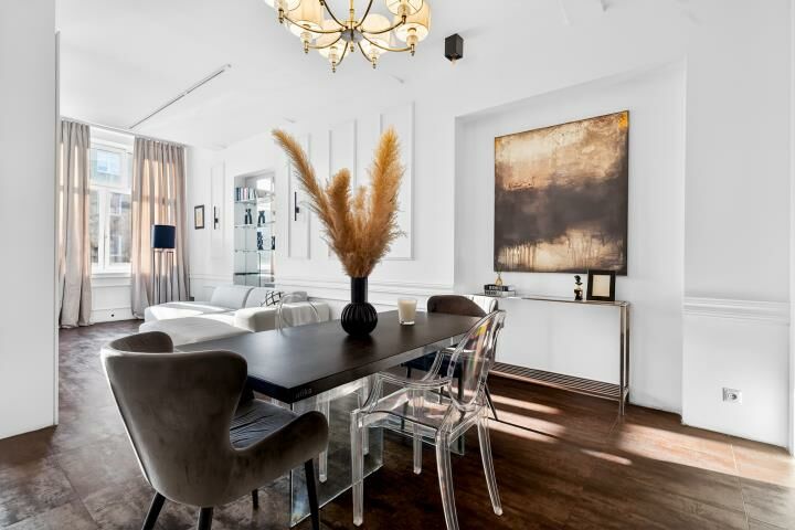 Aranżacja mieszkania została wykonana z wyjątkowym smakiem i bez kompromisów. Dominują tu szlachetne, ciemne tonacje, które w połączeniu z odpowiednio zaprojektowanym oświetleniem tworzą intymną, elegancką atmosferę rodem z nowojorskich apartamentów. To wnętrze jest nietuzinkowe, zdecydowane i bardzo charakterne idealne dla osób, które szukają czegoś więcej niż standardowych rozwiązań.