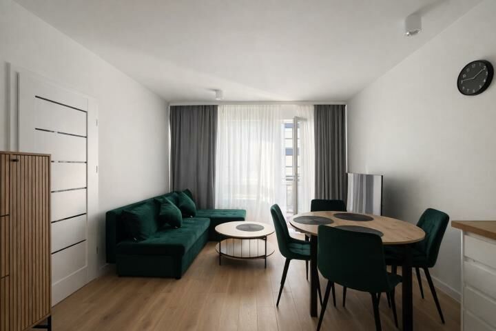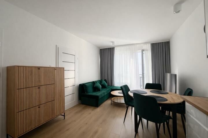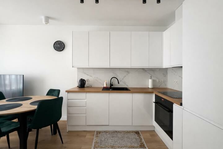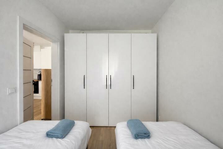 Mieszkanie jest wykończone w dobrym standardzie, umeblowane i w pełni wyposażone (pralka, piekarnik, okap, płyta indukcyjna, zmywarka). W sypialni łóżko, które można podzielić na dwa pojedyncze lub jedno podwójne.