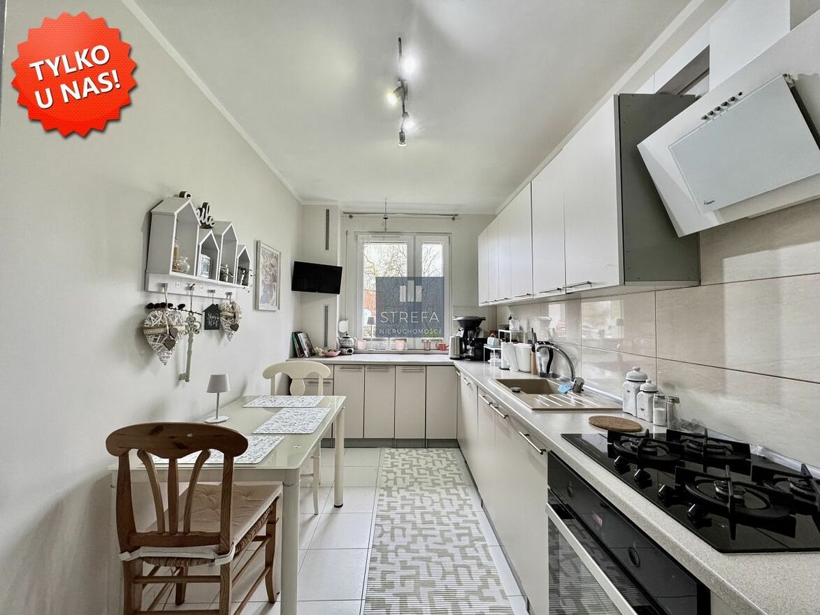 ustawną, dużą kuchnię z oknem, w pełni wyposażoną w zabudowę meblową oraz sprzęt AGD (płyta gazowa, piekarnik elektryczny, zmywarka 60 cm, lodówka, okap)