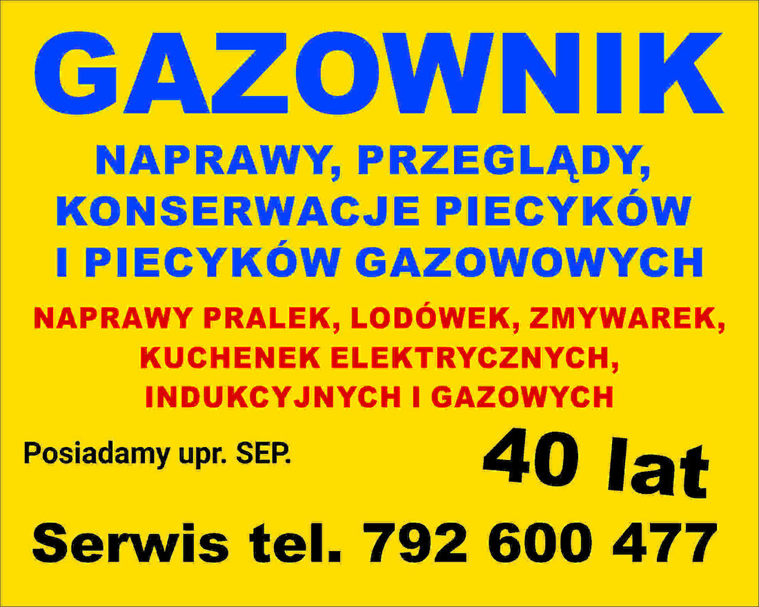 Naprawy przeglądy konserwacje pieców piecyków gazowych .Oraz naprawy pralek .lodówek, zmywarek, kuchenek gazowych, elektrycznych, indukcyjnych.