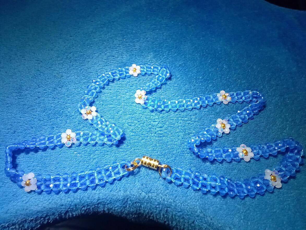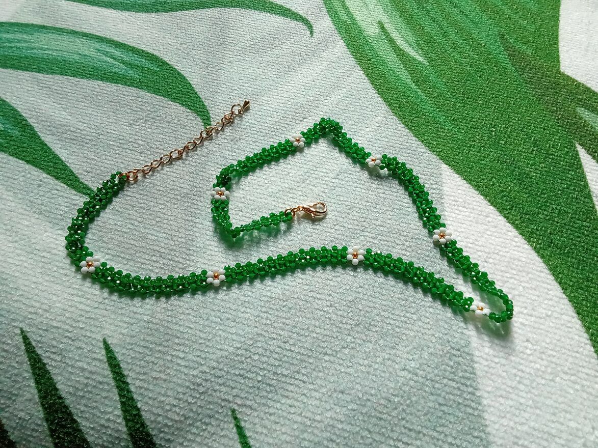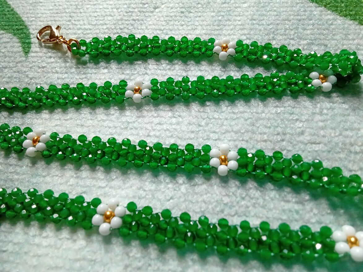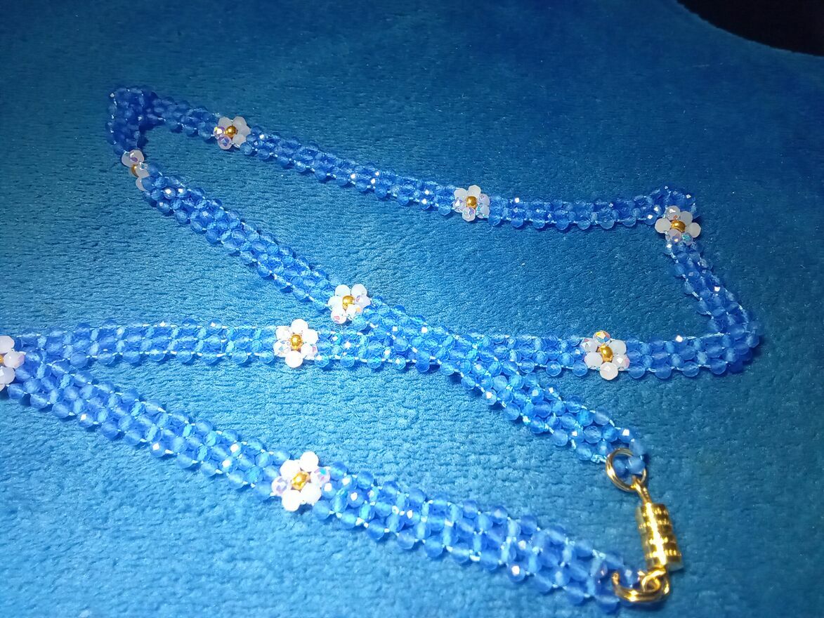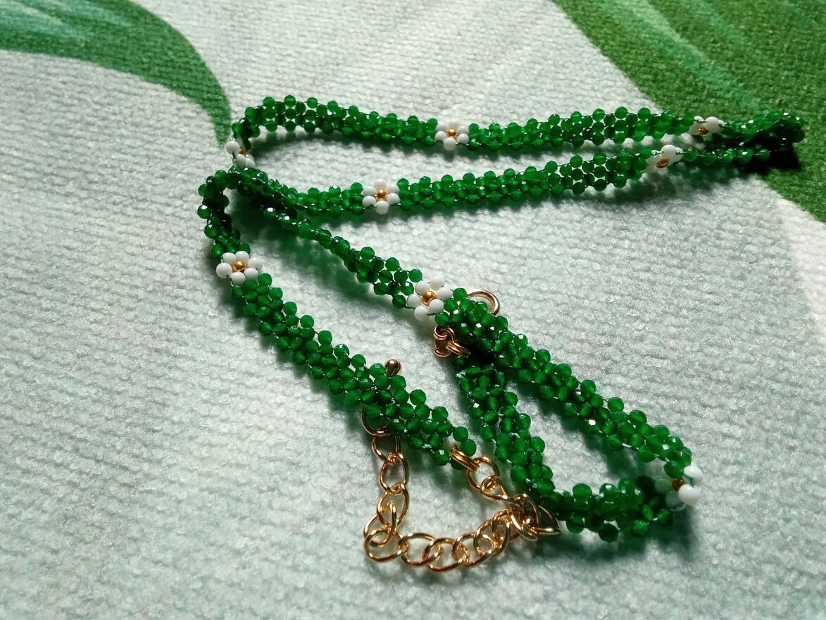 Naszyjnik ze szklanych kryształków fasetowanych, (szlifowanych) \'kocie oko\' 1,5-2mm, wykonany ręcznie na mocnej lince, z zapięciem zakręcanym lub karabińczyk z 5cm przedłużeniem z łańcuszka, długość z zapięciem 44cm.Nie używam żadnych sztucznych tworzyw, robię na indywidualne zamówienie przeróżne kolory, wzory, zapięcia, okucia.