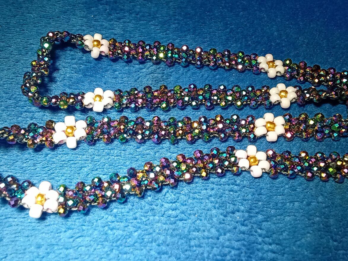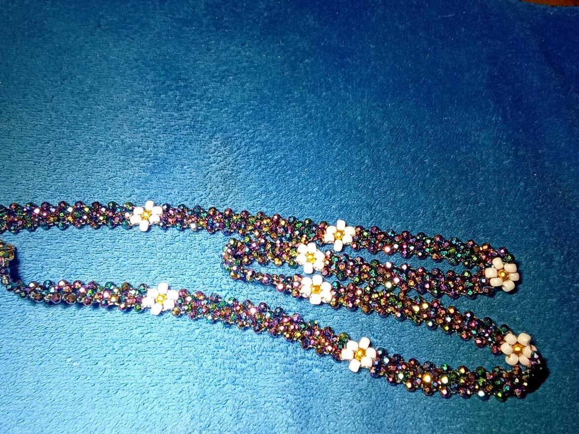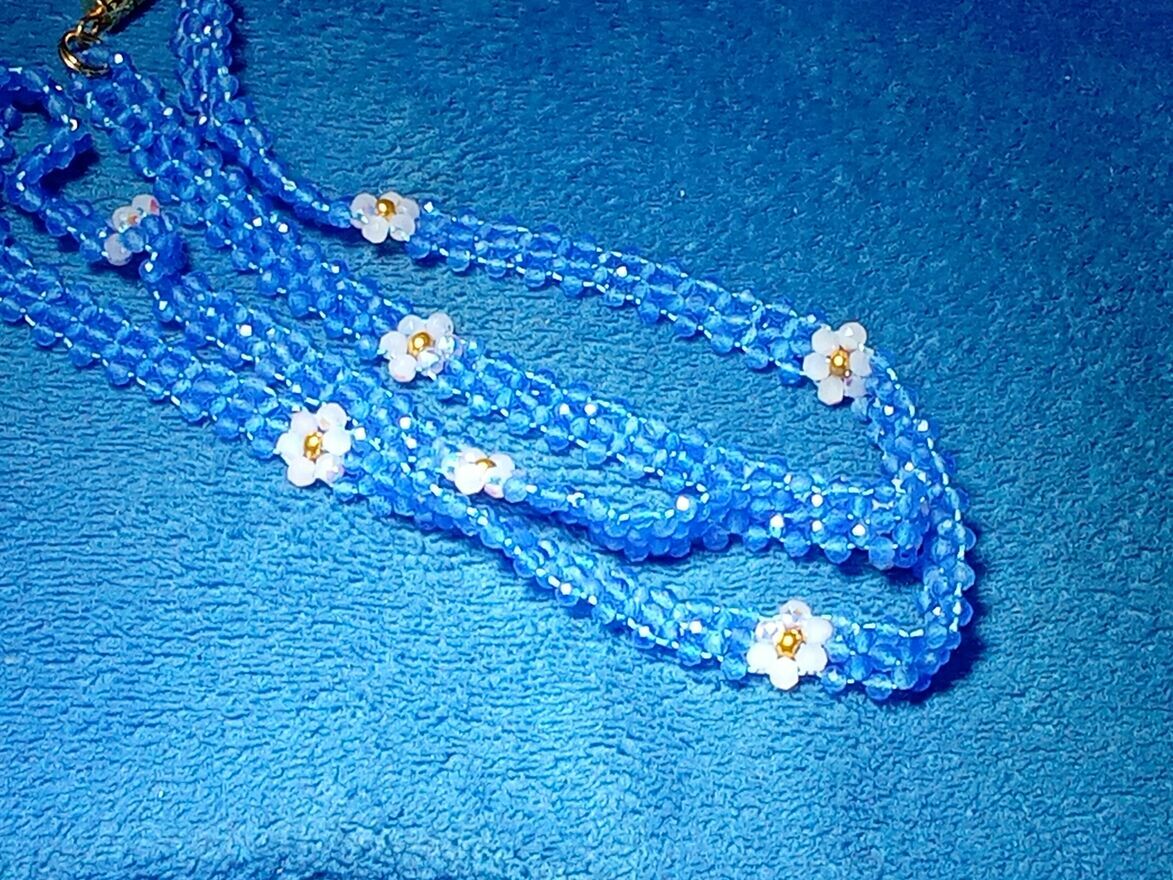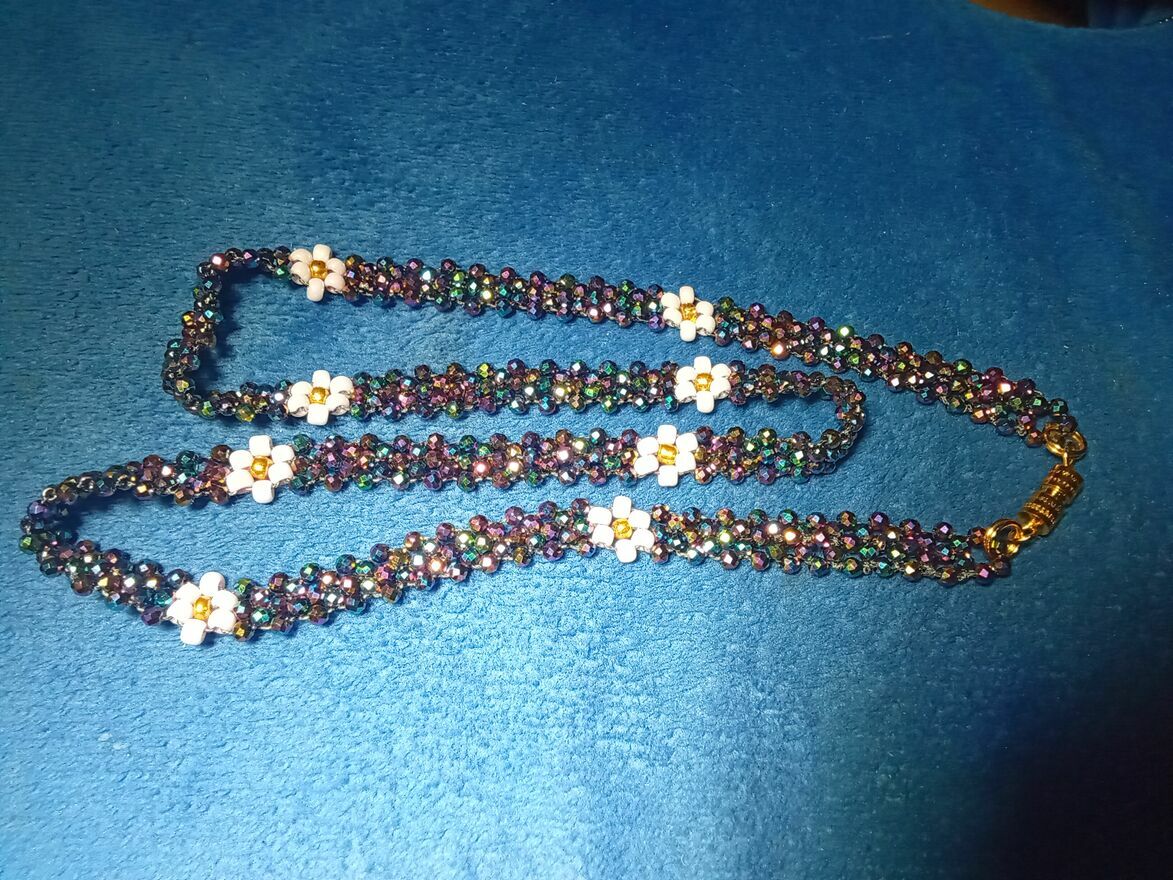 Naszyjnik ze szklanych kryształków fasetowanych, (szlifowanych) \'kocie oko\' 1,5-2mm, wykonany ręcznie na mocnej lince, z zapięciem zakręcanym lub karabińczyk z 5cm przedłużeniem z łańcuszka, długość z zapięciem 44cm.Nie używam żadnych sztucznych tworzyw, robię na indywidualne zamówienie przeróżne kolory, wzory, zapięcia, okucia.