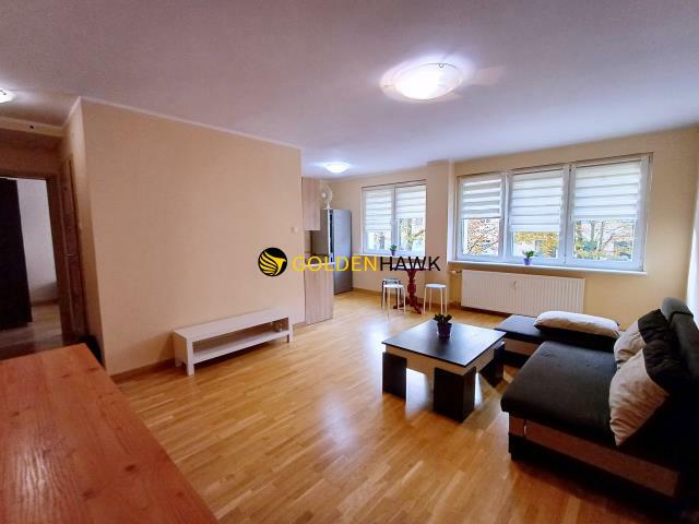 Dwupokojowe mieszkanie na pierwszym piętrze w bloku z monitoringiem. Pokój dzienny z aneksem kuchennym, drugi pokój z ...