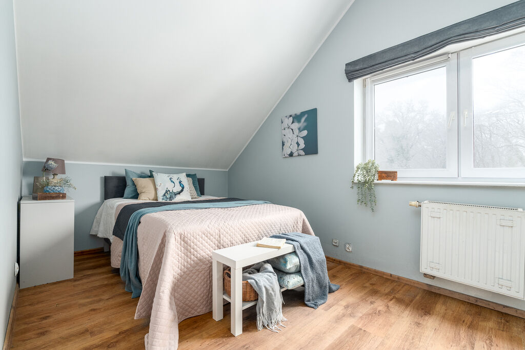 Strefa prywatna obejmuje stylową sypialnię o powierzchni dwunastu