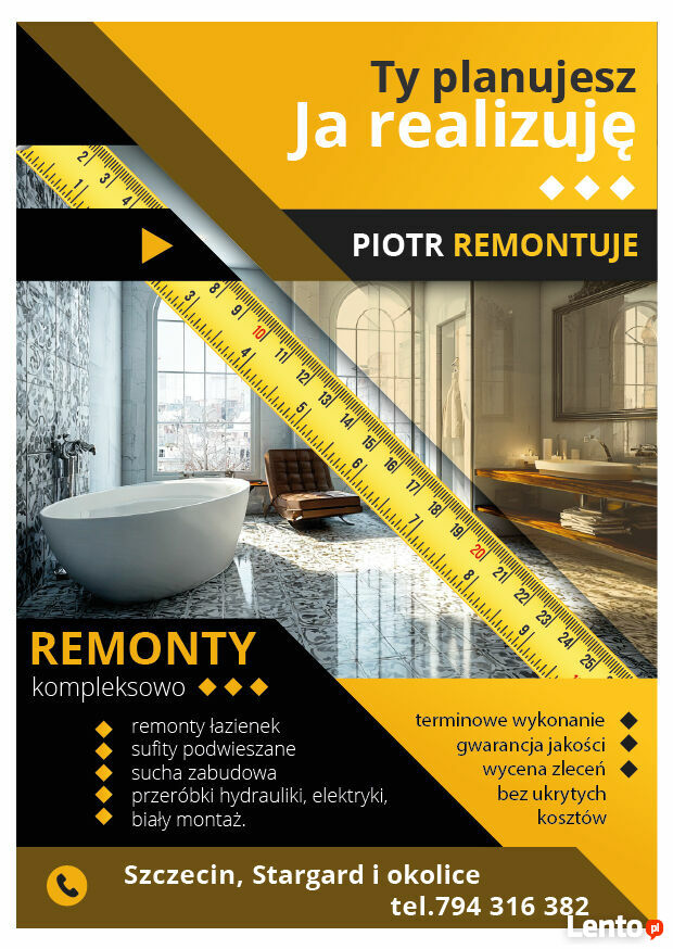 Zajmuję się kompleksowymi remontami łazienek,Sufity podwieszane, sucha zabudowa, przeróbki hydrauliki, elektryki, biały montaż. Łazienki pod klucz.Także malowanie oraz układanie paneli, montaż drzwi i szerszy zakres usług remontowo budowlanych.