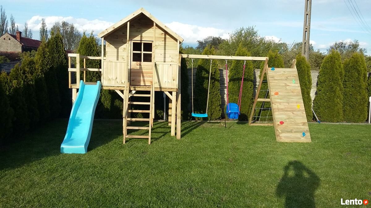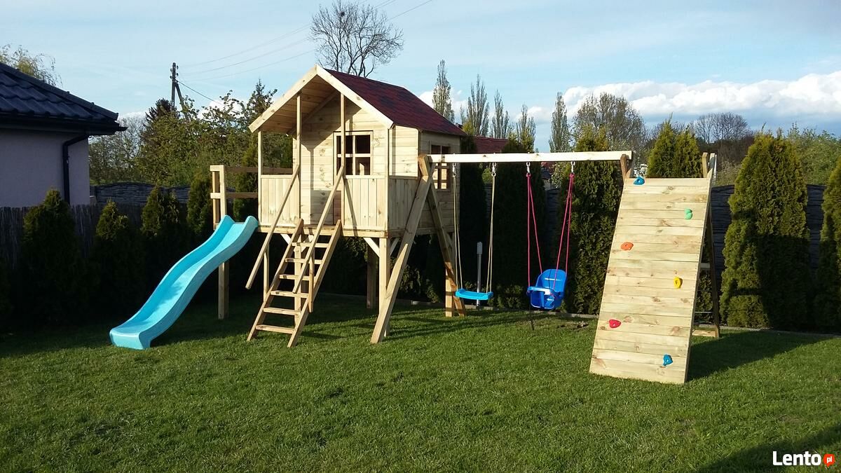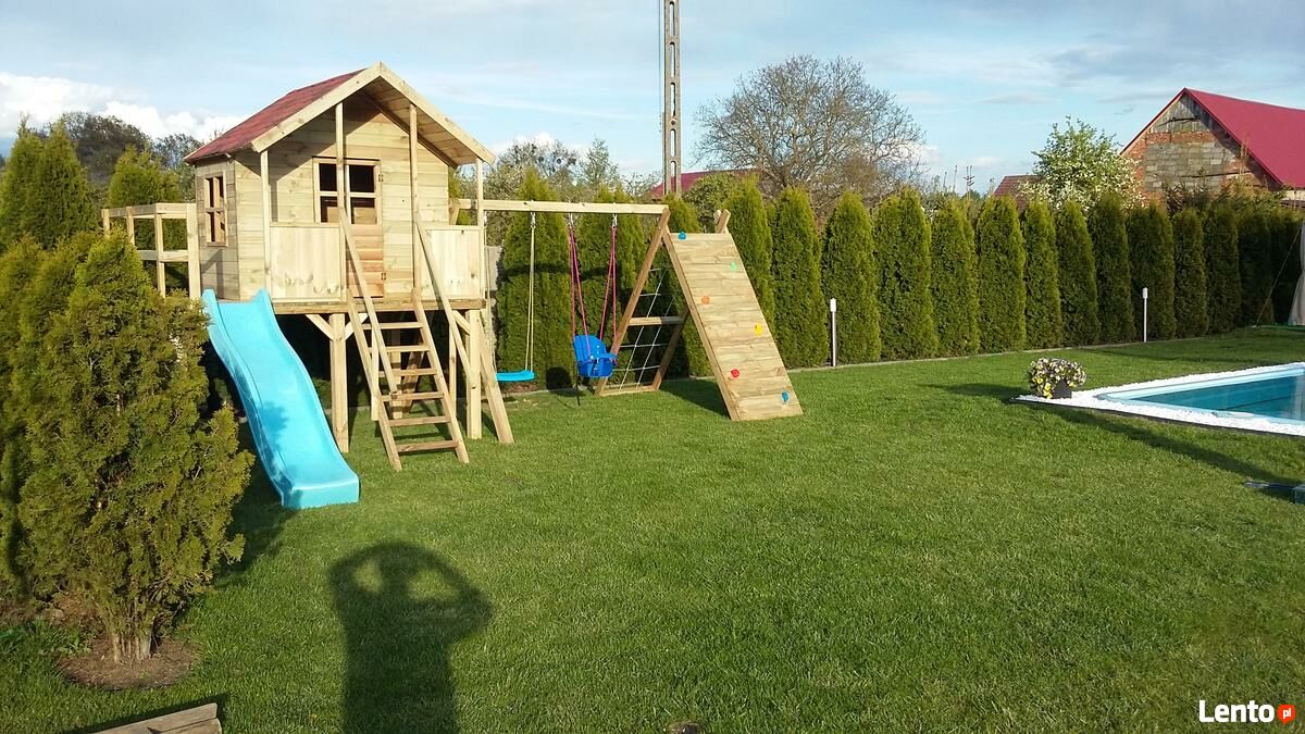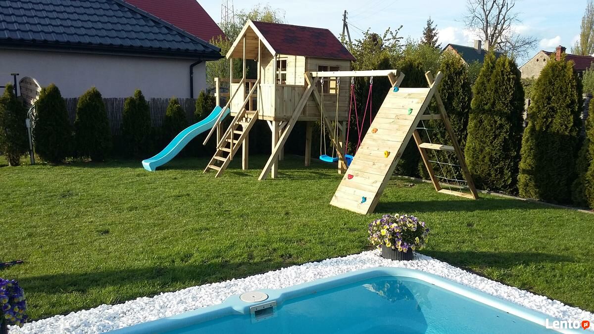 - z prawej strony domku przymocowany jest zestaw huśtawkowy -