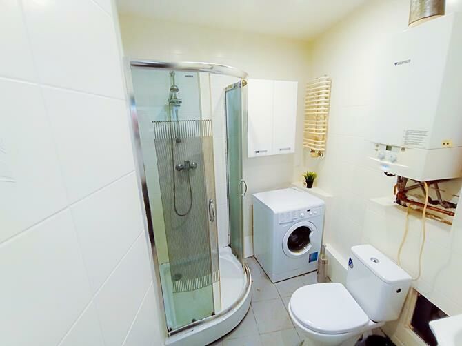 Łazienka: pralka, prysznic, umywalka, WC
