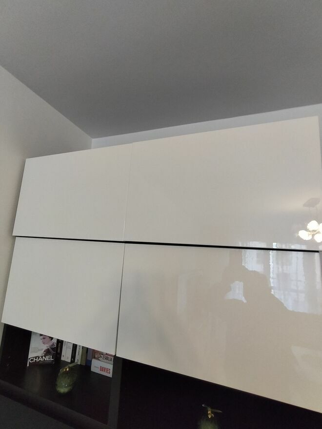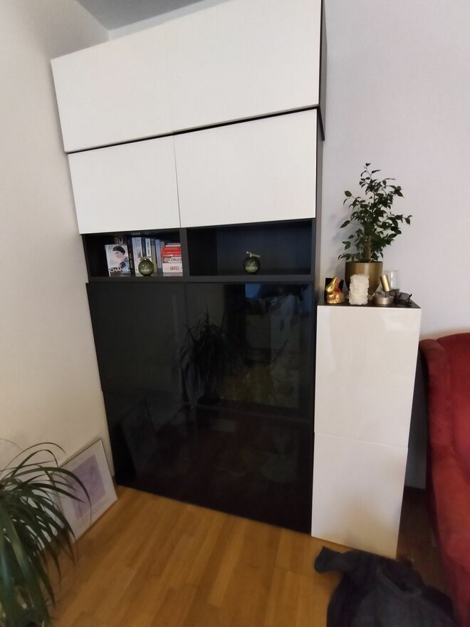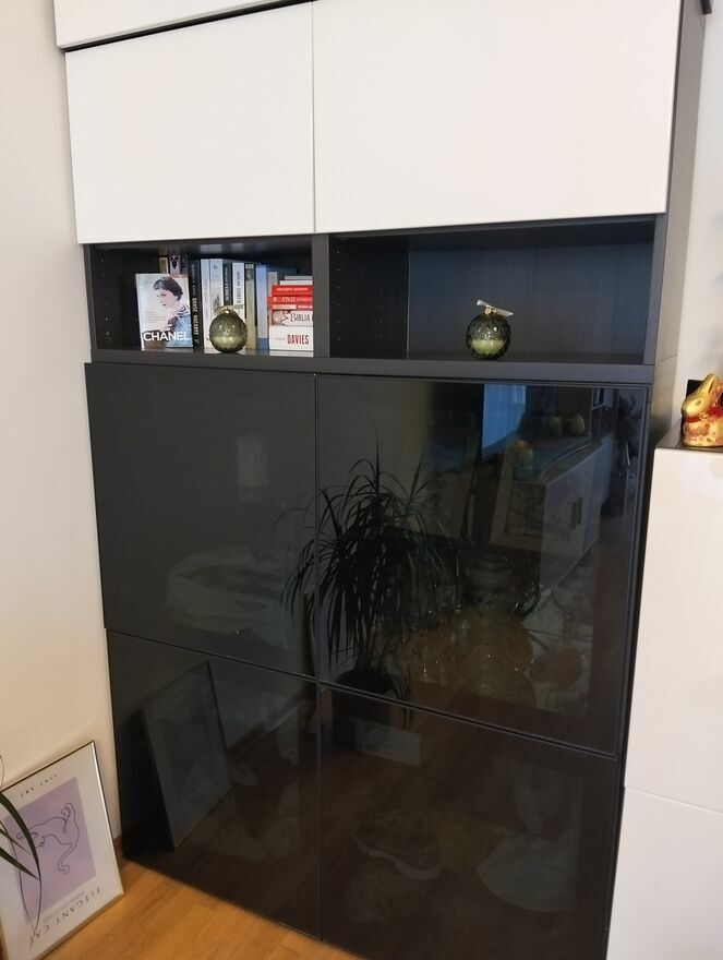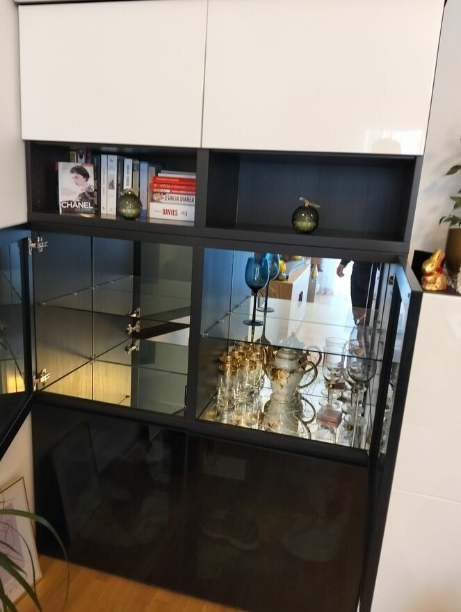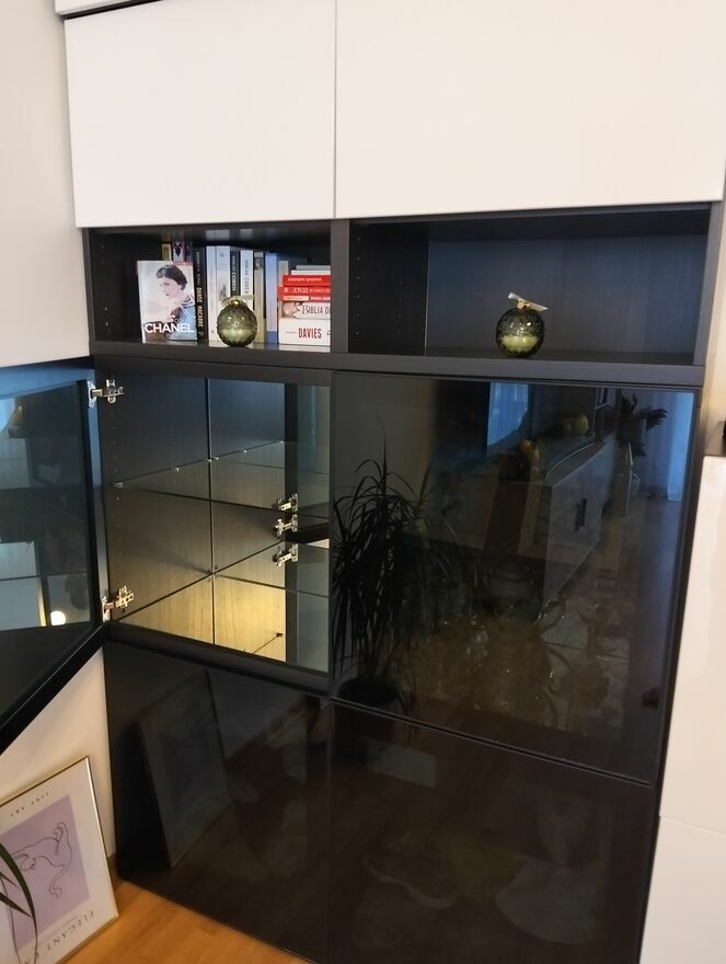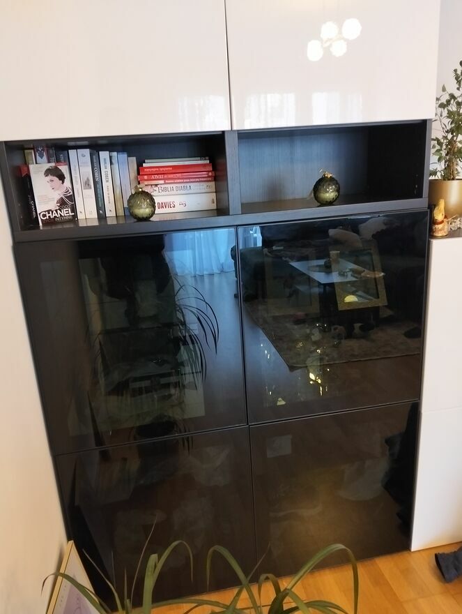 Sprzedam komplet regał plus dwie szafki w systemie modułowym Besta.Regał składa się z 4 zamykanych czarnych/szklanych drzwiczek , plus górna część, drzwiczki biały połysk.