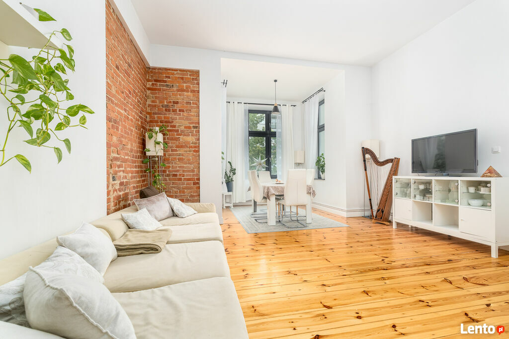oryginalną cegłą oraz odrestaurowane oryginalne drewniane podłogi.