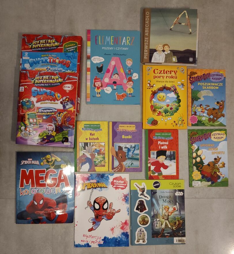 #Sprzedam zestaw książeczek dla dzieci, w tym elementarze, wiersze dla dzieci, kolorowanki, gazetki z łamigłówkami, itp. (Kot w butach, Bambi, Piotruś i Wilk, Scooby-Doo, Marvel, Spider-Man, Star Wars).Stan bardzo dobry, niewypełnianie za wyjątkiem kolorowanki Marvela (pokolorowane 3 strony na blisko 100 stron) oraz w bajce Kot w butach porwana 1 strona.